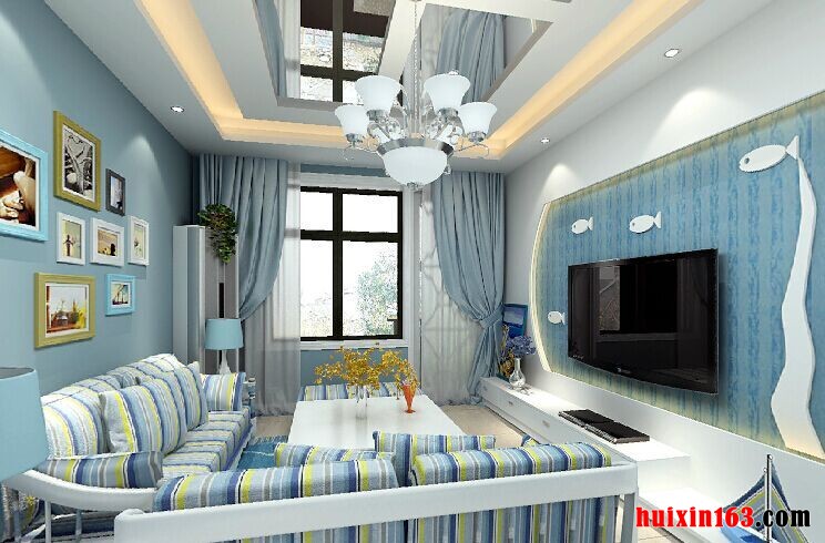 地中还风格的装修设计展现的是一种婉约与雅致,在本案例的设计当中,整个居室的空间面积并不是很大,但却显得比较时尚、唯美,例如客厅的装饰布置,采用双层石膏板粘贴吊灯,中间以镜面为装饰,搭配傻瓜一盏个性的吊灯,在视觉感观上给人一种扩大空间面积的感觉,而大量的运用留白处理,在通过浅蓝色的色彩加以点缀,让地中海风格的特点得到淋漓尽致的体现,不管是电视背景墙还是沙发背景墙都有着自己的设计看点,对于沙发背景墙而言,照片墙的设计就是很大的看点,不仅装饰空间环境,而且也是一种艺术的体现,如果在电视柜上适当的添置一些绿植,其效果可能会更加完美。