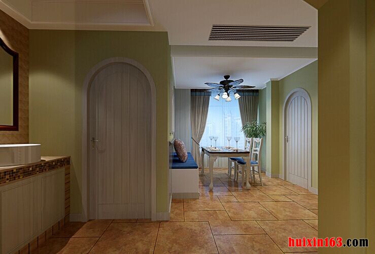 本案例的装修设计将地中海风格清新唯美的一面展现得淋漓尽致,整个空间的装饰布置并没有一味的追求元素堆砌,而是通过局部进行装饰点缀,将该风格的特点衬托得更加完美,在客厅的设计当中,采用平顶式的石膏板吊顶,背景色彩以白色为主,与地面仿古地砖有着一个相互呼应的效果,一盏个性的铁艺吊灯安装,让空间的时尚感展现得更加完美,电视背景墙和沙发背景墙都是以浅青色为主,两者遥相呼应,落地窗的设计搭配上轻质的窗帘,让空间的采光更加的明亮透彻,而且若影若现的室外景观还能适当的起到一个相互借景的效果,沙发背景墙壁画的悬挂也展现出一种艺术的氛围。