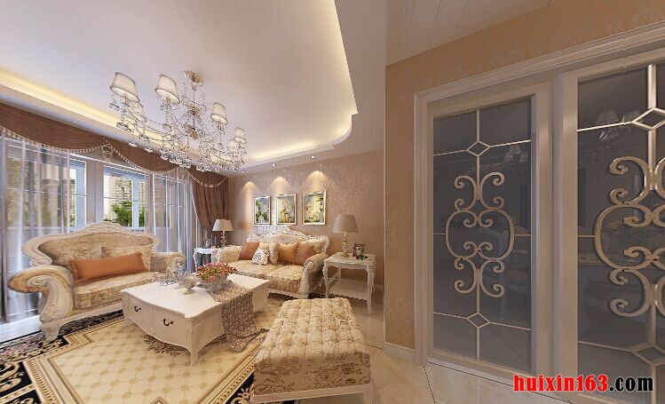 简欧风格的装修设计既有着现代简约的时尚感,也有着欧式风格的奢华效果,在本案例的设计当中,通过对造型的设计以及色彩的搭配,展现出一种浪漫、温馨的效果,例如客厅的设计,采用平顶式的石膏板吊顶,背景色彩以白色为主,搭配上一盏亮丽的水晶吊灯,墙面四周射灯的安装,局部明亮的光线照射,演绎出一种繁星点缀的效果,大理石铺设的电视背景墙,展现出一种奢华味道的同时,也让空间营造出一种温馨浪漫的氛围,这也是家独有的特点所在,其中地毯的色彩以及样式也是空间的一大设计看点,局部的黑色布艺,在这个充满温馨的环境当中,起到一个点缀的效果。
