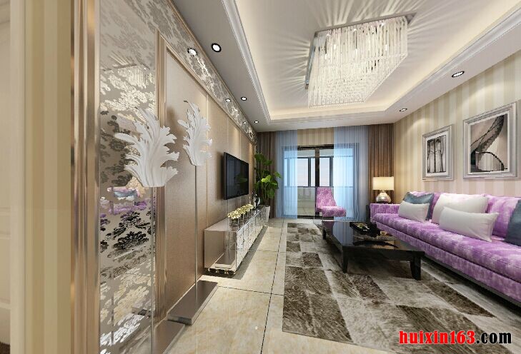 本案例是一套96平米的三居室,采用现代简约的装修风格,通过设计师精心的搭配设计,打造出一个称心如意的居室环境,整个居室的空间面积并不是很大,但却显得比较舒适,在客厅的装饰当中,采用平顶式的石膏板吊顶,搭配上一盏亮丽的水晶吊灯,将空间营造得比较明亮透彻,开放式的餐厅设计,在视觉感观上给人一种扩大空间面积的效果,紫色的沙发布艺与餐椅更是起到一个色彩的点缀效果,而起到好处的绿植添加,通过富有跳跃性的绿意装饰,让空间多出一份活跃的氛围,墙面四周射灯的安装,局部明亮的光线,演绎出一种繁星点缀的效果。