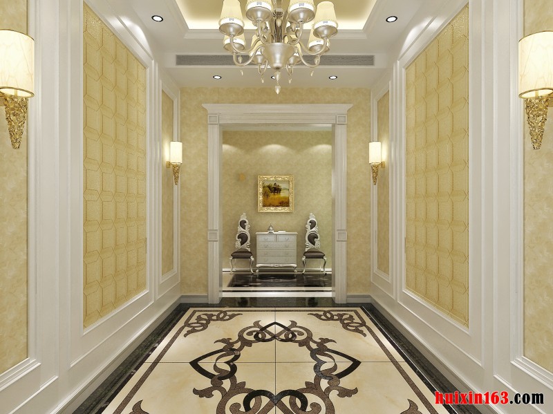 在墙面上采用石膏板打造出优雅的简约欧式的效果,搭配上复古造型的壁饰烛台,只不过烛台上面是现代化的照明设施,在设计中将现代化与华贵的欧式风情融合在了一起是个非常好的创意。在过道区域的顶面上设计了六个方格的造型,每个风格里面一盏明亮的射灯,以及一圈明亮的黄色灯带,给人的感觉非常的大方雅致。