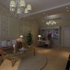 客厅和书房的布局呈现出一个统一的格局,这样子在家里面办公和待客都非常的方便,整个人的生活状态也非常的充实。在墙面上采用了浅色碎花图案的墙纸,搭配一些空白的画框,让整体的空间非常的具有层次感。在地面上铺设的地板呈现出纵横交错的状态,原木色的地板,带给人一种亲近自然的感受。 欧式风格输左和欧式的书柜,体现出简约高雅的情调。在顶面上采用两排明亮的射灯实现了客厅和书房的分区。在客厅的位置采用了圆形的土色的地毯,搭配金色框架的玻璃茶几,材质之间的冲突感非常的美妙。