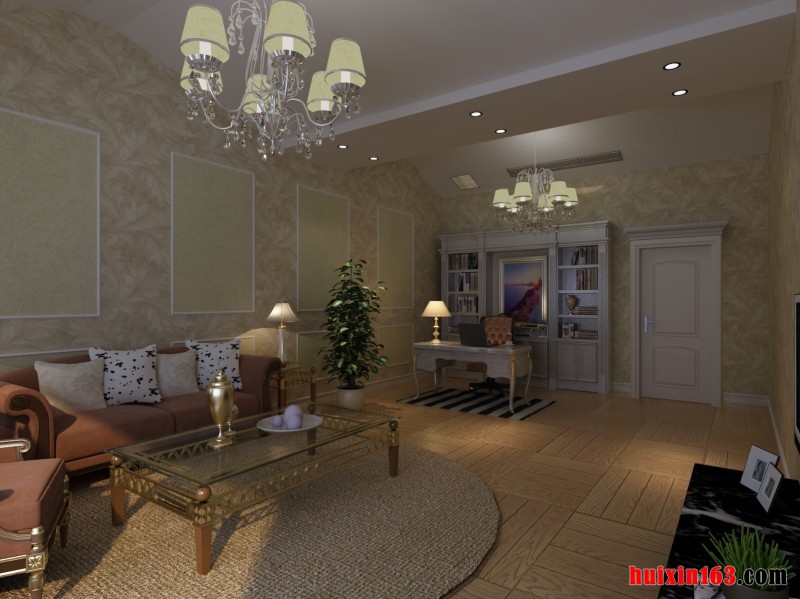 欧式风格输左和欧式的书柜,体现出简约高雅的情调。在顶面上采用两排明亮的射灯实现了客厅和书房的分区。在客厅的位置采用了圆形的土色的地毯,搭配金色框架的玻璃茶几,材质之间的冲突感非常的美妙。