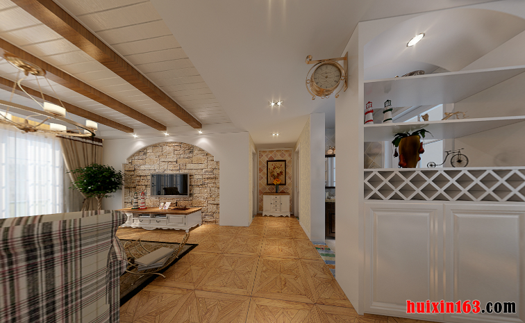 本套为美式风格装修,客厅地面采用的是地板进行装修,局部采用的是地毯进行装饰,墙面采用的是墙纸进行装修,电视背景墙拱形造型,内贴文化石,石头乡村气息凸显无疑,点缀舒适生活完美细节所带来的高端气魄,体会缤纷配套营造的细腻生活情调引领泉城人居创新理念;餐厅:白色装饰酒柜,典雅美观;原木色假梁吊顶,粗狂随意。餐厅用酒柜把卫生间隔阂开了,轻盈通透、最大的好处在于让两个空间隔而不断,彼此保持呼应,整个空间通透,开敞,充满了现代时尚感。整个空间给人一种干净整洁的感觉,富有时尚的生活气息。 更多»推荐小区效果图