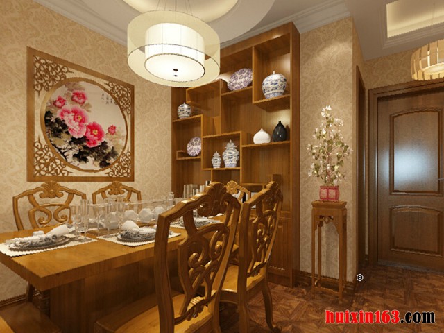 餐厅的打造犹如宫廷般奢华和古典,整体的实木餐桌椅的搭配更具有一致性的装修意义,白色花纹墙面的设计和大型的中式装饰画雕刻让空间的装饰感更加的突出,旁边的一个整体的实木搁置架的存在可以是展示装饰品的位置,还为餐厅的整体中式装饰感带来更大层次的装修意义。