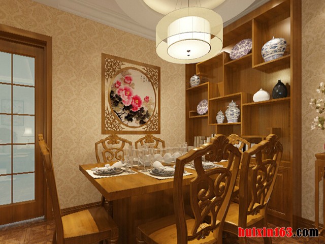 餐厅的打造犹如宫廷般奢华和古典,整体的实木餐桌椅的搭配更具有一致性的装修意义,白色花纹墙面的设计和大型的中式装饰画雕刻让空间的装饰感更加的突出,旁边的一个整体的实木搁置架的存在可以是展示装饰品的位置,还为餐厅的整体中式装饰感带来更大层次的装修意义。