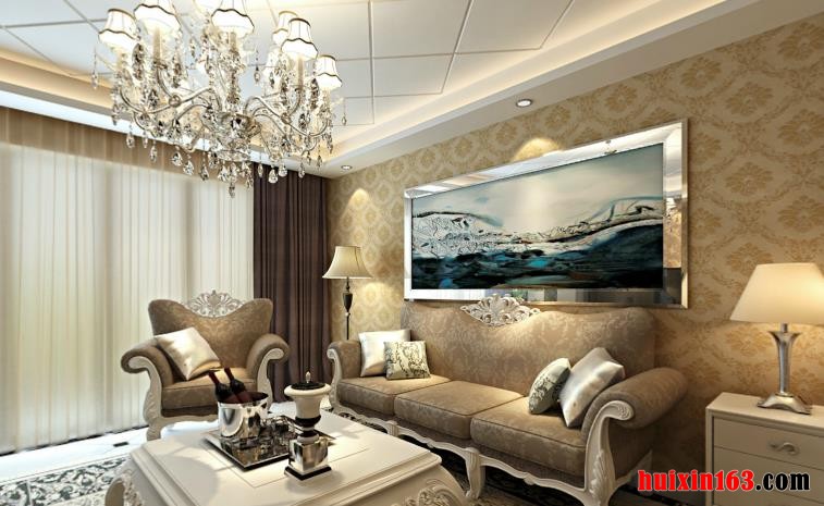 花纹墙纸贴饰电视背景墙,黑镜条结合硬包搭配,挂壁式电视机设计,整体感觉时尚新颖、个性高雅。白色欧式电视柜搭配,与背景墙形成明显对比,很容易让人找到视觉平衡感,也更显和谐。拼花地板设计,精美花纹地毯过渡,做工精细,造型优雅的白色茶几,桌边经过精心雕饰,雕花精美细腻,体现出了欧式家居的魅力。茶色印花皮质沙发,白色结构框架,椅背顶梁精美雕花装饰,将沙发的档次提升了上来,今天高贵典雅、端庄雍容。花纹墙纸装饰沙发背景墙,装饰画点缀,散发着浓郁的艺术气息。凹位造型吊顶,在一定程度上增加了客厅的层次感,菱形格子造型设计,华美的水晶灯点缀,浪漫优雅、璀璨夺目。