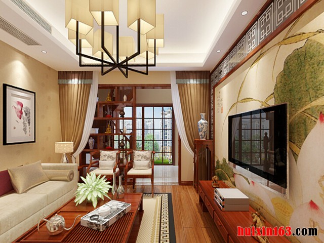 客厅的装饰给人清爽明亮大气的感觉,白色的石膏板吊顶装饰搭配上一个实木框架的大型吊灯设计为空间的温馨气氛带来更多的展示,白色的印花墙面装饰增加了空间的明亮度和延伸感,白色的沙发装饰搭配上实木框架的家具起到现代和中式古典结合的装修手法,为空间的装修档次带来很高的提升,客厅旁一个实木的框架不仅起到空间的划分,产生的装饰感也是比较突出和浓烈的。电视背景墙的打造采用了荷花的装饰画带给空间的中式古典韵味比较突出,还从一定的程度上提升了主人的生活品味。