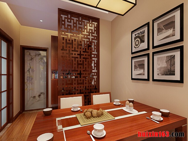 餐厅的空间是以一个独立的位置存在的,餐厅顶面装饰简单大气中式的吊灯使用衬托了空间的温馨气氛,白色的墙面上四副复古的装饰画给人一种经历年代的时代感,实木的餐桌椅搭配和旁边的实木雕刻框架不仅起到划分空间的作用,展现出的中式古典装饰韵味也是比较完善的。