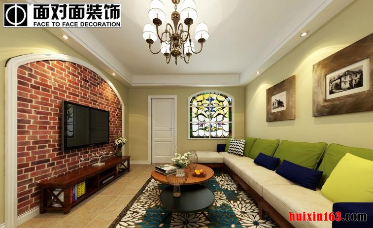 浅鹅黄色墙漆粉饰墙面,淡淡的颜色,好似早春柳树柳花的颜色,给人清新宁静的美好感觉。垭口电视背景墙造型设计,仿砖墙墙纸装饰,形象立体,真实自然,实木电视柜搭配,造型简约却很实用,与背景墙搭配也十分恰当,符合回归自然的设计理念,也营造出了简朴自然且高雅的氛围。纯净的白色凹位造型吊顶设计,看上去清雅简约,铁艺吊灯搭配,给人一种别致清雅、与众不同的舒适感。装饰画装饰着沙发背景墙,丰富了墙面内容,使其看上不会显得单调平素,在柔和的灯光照射下,光影结合,更显立体。仿古砖铺地,质地自然朴实,且自身有点颇多,运用在田园风格的家居中再合适不过,精美花纹地毯过渡,圆形桌面双层茶几搭配,美观实用,朴实自然。浅色简约转角皮质沙发,实木结构框架,纯绿色靠包及多彩的靠枕装饰,倍感清新自然,舒适惬意。