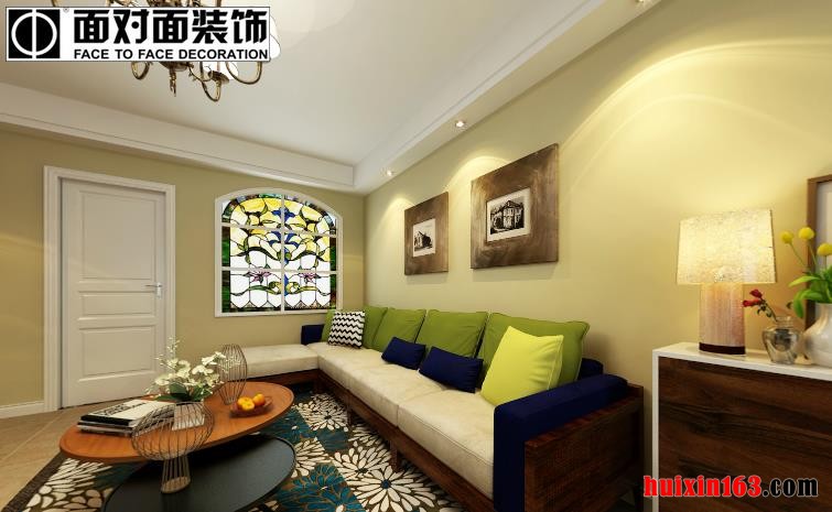 浅鹅黄色墙漆粉饰墙面,淡淡的颜色,好似早春柳树柳花的颜色,给人清新宁静的美好感觉。垭口电视背景墙造型设计,仿砖墙墙纸装饰,形象立体,真实自然,实木电视柜搭配,造型简约却很实用,与背景墙搭配也十分恰当,符合回归自然的设计理念,也营造出了简朴自然且高雅的氛围。纯净的白色凹位造型吊顶设计,看上去清雅简约,铁艺吊灯搭配,给人一种别致清雅、与众不同的舒适感。装饰画装饰着沙发背景墙,丰富了墙面内容,使其看上不会显得单调平素,在柔和的灯光照射下,光影结合,更显立体。仿古砖铺地,质地自然朴实,且自身有点颇多,运用在田园风格的家居中再合适不过,精美花纹地毯过渡,圆形桌面双层茶几搭配,美观实用,朴实自然。浅色简约转角皮质沙发,实木结构框架,纯绿色靠包及多彩的靠枕装饰,倍感清新自然,舒适惬意。